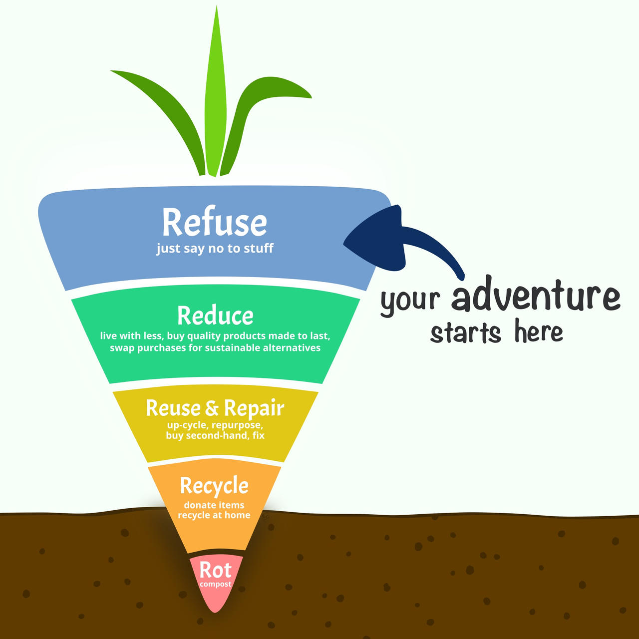 A starting point would be to integrate the 5 Rs, Refuse, Reduce, Reuse, Repurpose, Recycle (see graphic), into our way of living. Zero waste management, a global initiative geared towards reducing waste, is an aspiration to achieve. The 5R’s is the mechanism to decrease the number of things we use and simultaneously decrease the number of things we throw away. The upside to this effort would be to reallocate conserved resources to less developed countries.